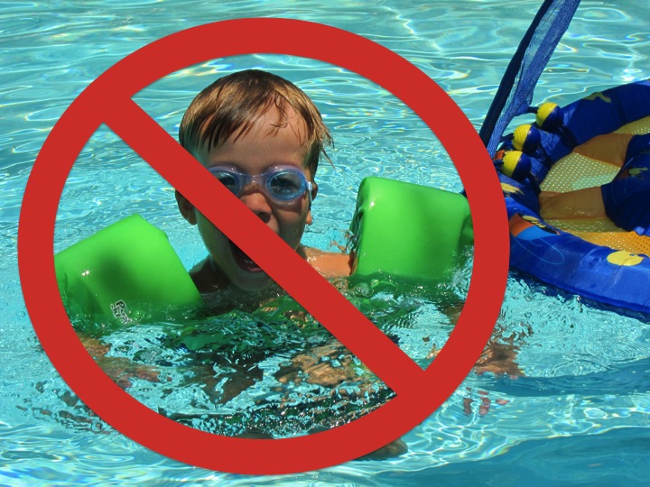 Though innocently disguised in bright reds and blues or patterns of flowers, water wings (also known as “floaties”) are one of the more dangerous “safety” devices and can a