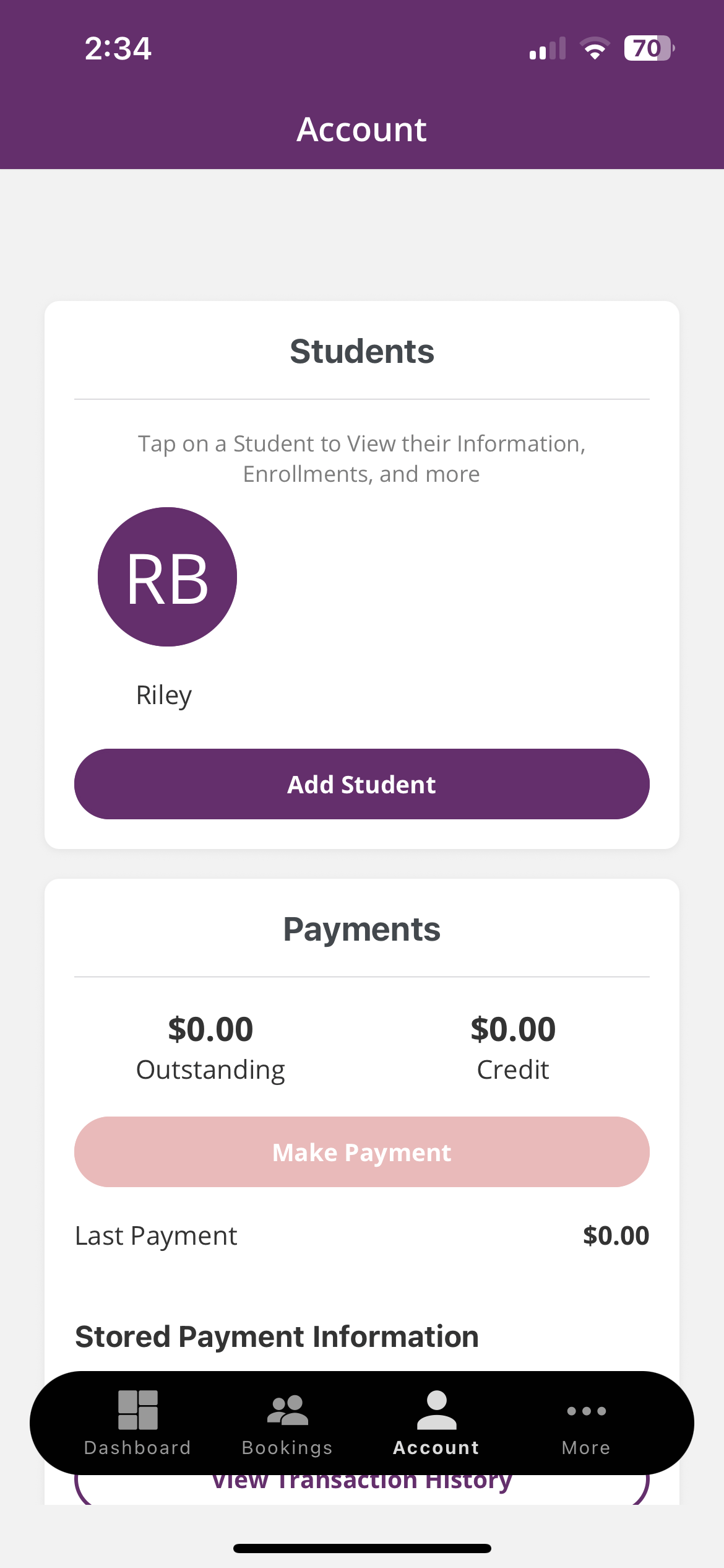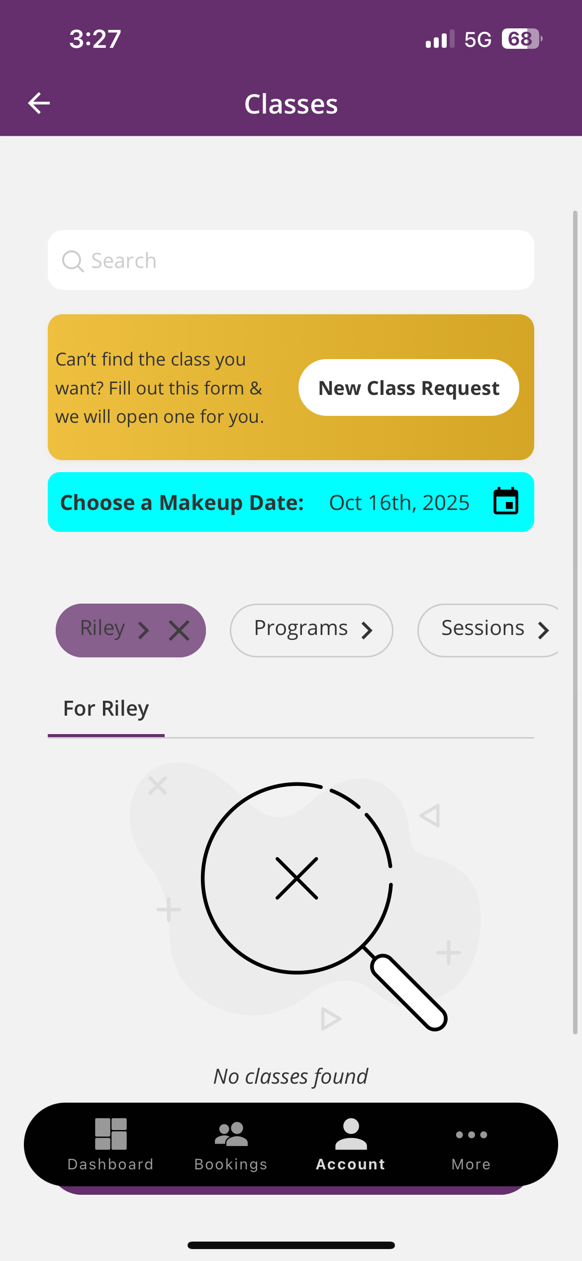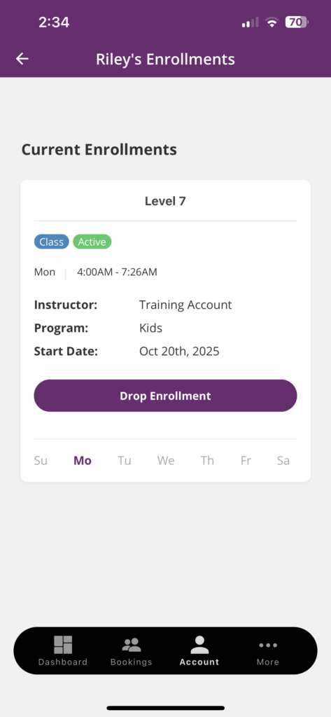2. Tap your child’s name to view their Enrollments, including class day, time, and instructor