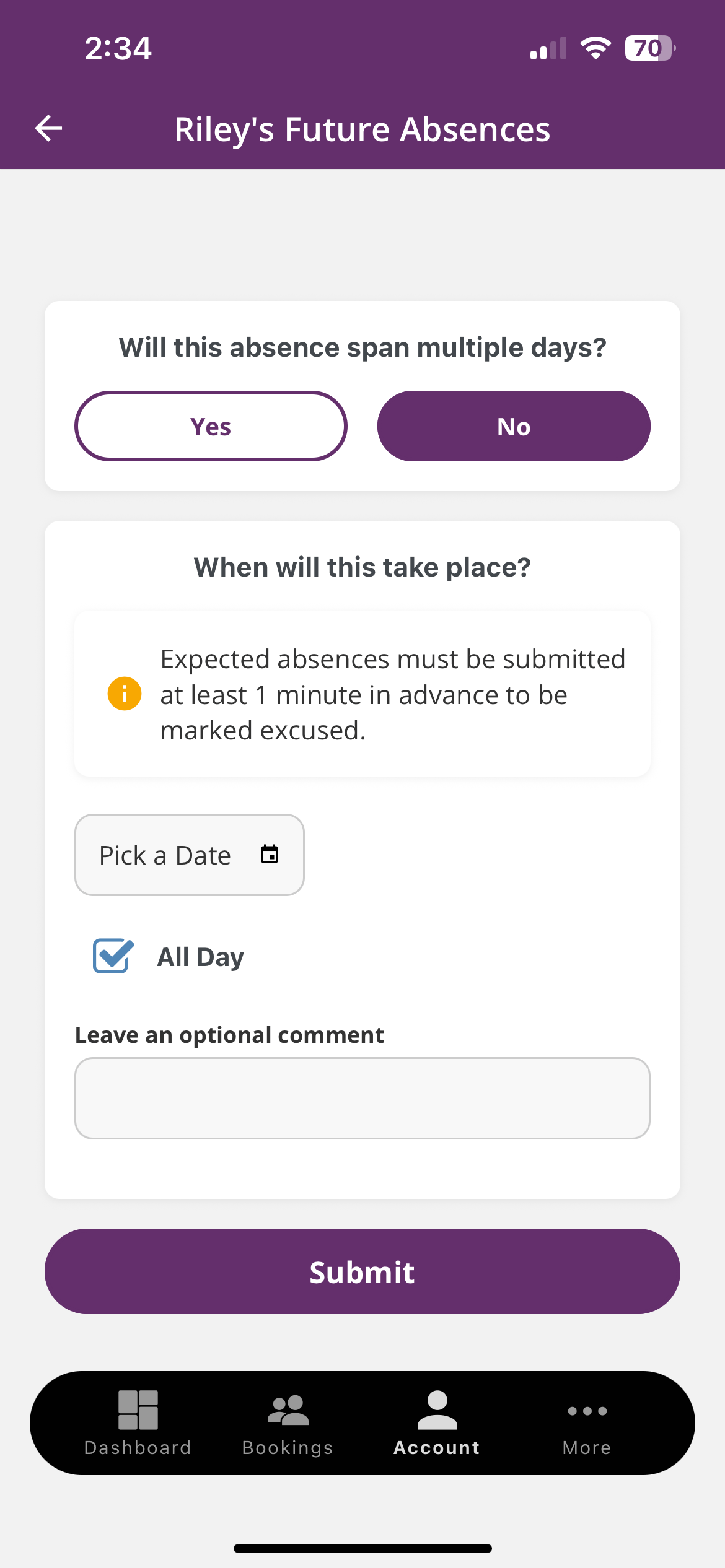 3. If the absence spans multiple days, select Yes or No depending on the number of days